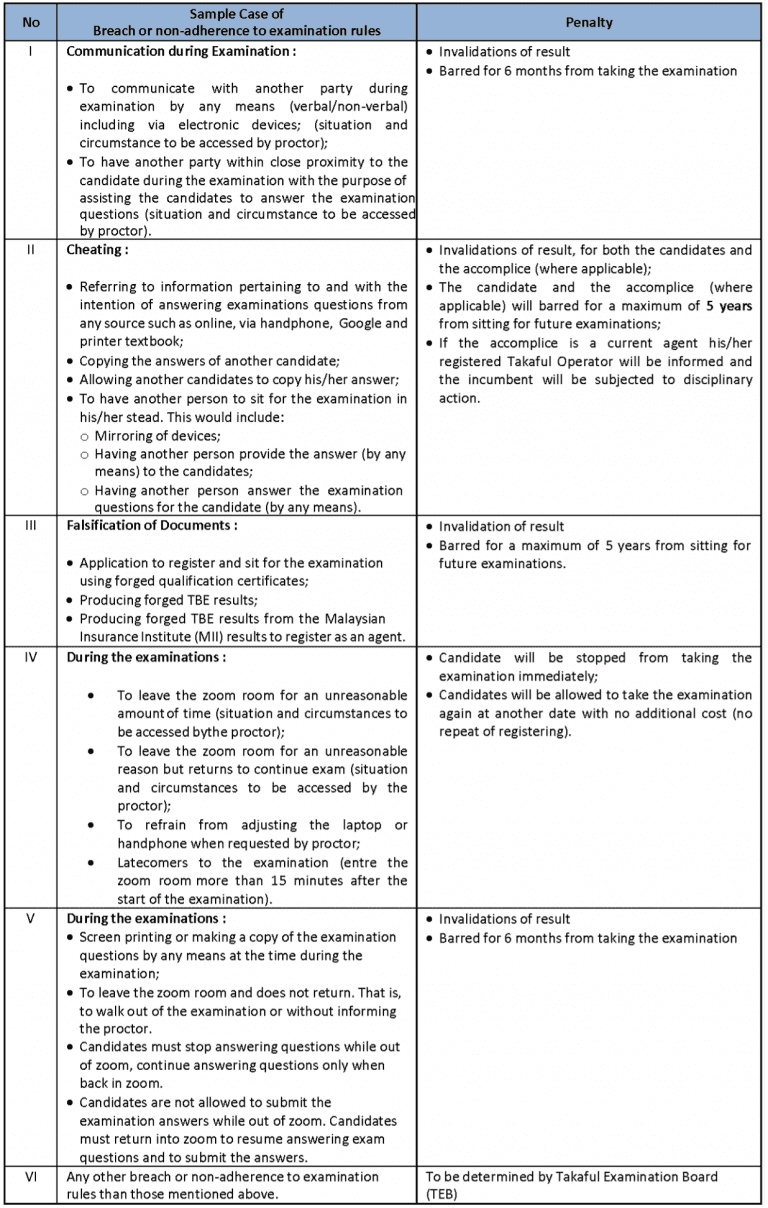 - Persatuan Takaful Malaysia (MTA) berhak untuk menarik balik, menahan atau membatalkan keputusan atau sijil pada bila-bila masa yang berkaitan dengan sebarang dakwaan pelanggaran peraturan dan prosedur peperiksaan. MTA merupakan pihak berkuasa yang boleh mengenakan penalti ke atas calon peperiksaan yang didapati bersalah melakukan sebarang kelakuan tidak jujur atau tidak profesional atau melanggar mana-mana undang-undang, peraturan atau prosedur peperiksaan.
